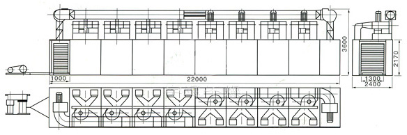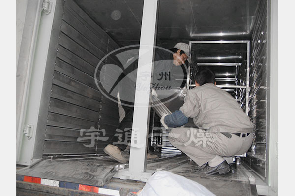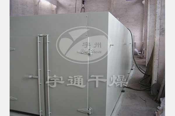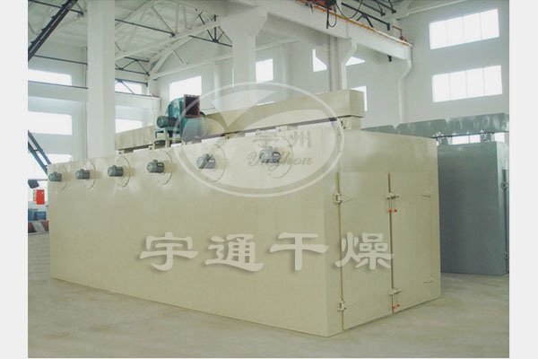 物料經(jīng)裝盤后,連盤帶車進(jìn)入隧道烘箱的進(jìn)口處,由傳動機(jī)構(gòu)將其帶入隧道內(nèi), 烘車運(yùn)行速度可調(diào);冷風(fēng)從新風(fēng)補(bǔ)充口進(jìn)入離心風(fēng)機(jī),經(jīng)翅片式換熱器加熱后, 送入隧道箱內(nèi)與濕物料充分接觸,進(jìn)行熱量交換,物料內(nèi)的水分被蒸發(fā)為水蒸汽 ,與熱空氣一道進(jìn)入箱體側(cè)面的風(fēng)道內(nèi),一部分濕空氣由排濕口排空,另一部分 由離心風(fēng)機(jī)吸入后,循環(huán)使用;由于每個單元的物料的含濕量不同,每個單元的 排濕量與循環(huán)風(fēng)量的比例也各不相同;在整個干燥過程中,熱風(fēng)溫度也均不相同 ;干燥初期的物料含水率較高,可選用較高的熱風(fēng)溫度;干燥后期的物料含水率 較低,可選用較低的熱風(fēng)溫度。