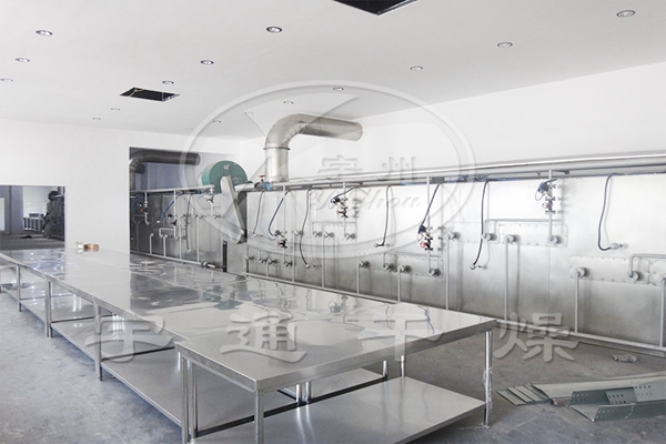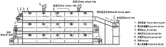 該機屬廂式結(jié)構(gòu),廂內(nèi)設有多層傳送帶,傳送帶在廂內(nèi)循環(huán)運動。物料均勻分布在層傳送帶上,通過鏈條的傳動,由層網(wǎng)帶倒入下一層網(wǎng)帶,下層反向交替逐一直落到后一層網(wǎng)帶,此時物料水份也達到烘干要求??諝庋h(huán)采用逆流工藝,高溫低濕空氣從干燥機下層網(wǎng)帶向上穿流,進行傳質(zhì)傳熱,從而達到去除水份的目的,尾氣通過引風機由頂部排出。設備自動化程度高,物料在干燥過程自動翻料,保證物料干燥均勻。勞動強度低,工作環(huán)境好,設備維護簡單。箱底設計有落料斜板及快開清掃門,便于清理箱內(nèi)粉料。