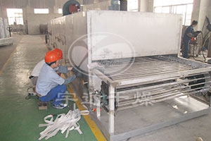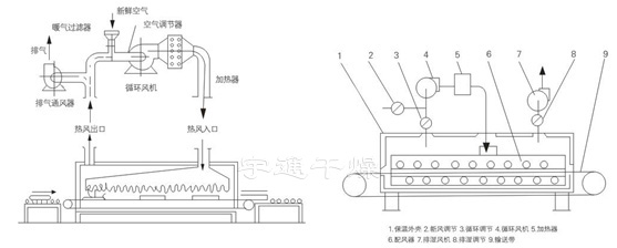 工作時熱風(fēng)以孔束流由上下同時噴向輸送帶上的物流,由于噴射氣速高達(dá)15m/s以上,故對流傳熱的膜極薄,傳熱系數(shù)大,干燥速度快,該設(shè)備用與不透氣類物料時,上面噴射氣流仍返回上面,下面噴出的氣流仍返回下面,在參與循環(huán)。對透氣性物料氣流束具有強(qiáng)穿透性及在物料內(nèi)部的擴(kuò)散性。使用熱源可以是蒸汽,電,熱風(fēng)爐及燃油煙道氣等。