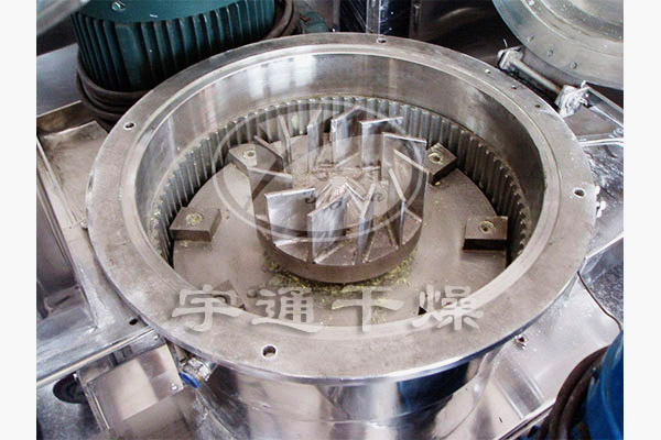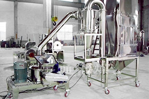 物料由料斗經螺旋輸送器進入粉碎室,粉碎物經高速刀片剪切獲得粉碎,通過負壓風運的方法把物料運入旋風分離器,袋式除塵器、排出物料達到產品的要求。