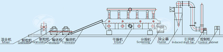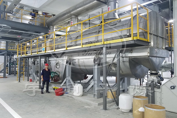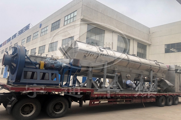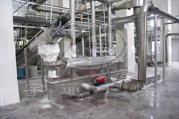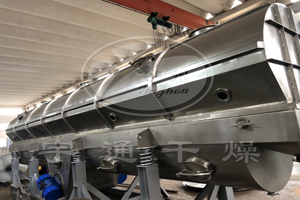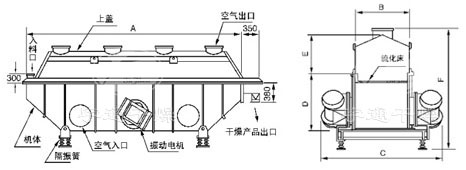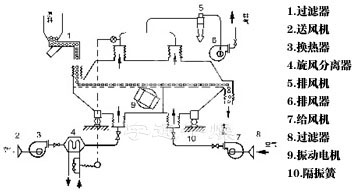 物料自進料進口進入機內(nèi),在振動力作用下,物料沿水平面流化床拋擲,向前連續(xù)運動,熱風向上穿過流化床同濕物料換熱后,濕空氣經(jīng)旋風分離器除塵后由排風1:3排出.干燥物料由排料進口排出。