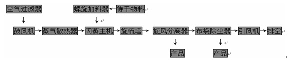 經(jīng)過(guò)初、中效過(guò)濾的環(huán)境空氣由干燥系統(tǒng)引風(fēng)機(jī)吸入熱風(fēng)空氣,與蒸汽換熱后產(chǎn)生的熱風(fēng)進(jìn)入閃蒸干燥主機(jī),與經(jīng)過(guò)螺旋加料器送入干燥主機(jī)的待干燥濾餅,在干燥主機(jī)內(nèi)完成傳熱傳質(zhì)的干燥過(guò)程,氣固混合物由旋風(fēng)分離器和布袋除塵器分離,物料被從干燥系統(tǒng)氣體內(nèi)分離出來(lái),排出干燥系統(tǒng),尾氣由引風(fēng)機(jī)排入大氣。