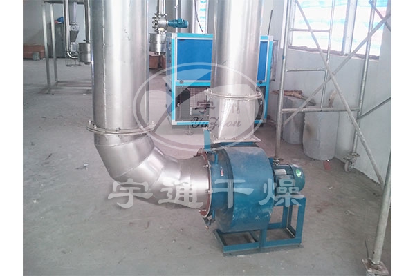 空氣經(jīng)過濾和加熱,進入干燥器頂部空氣分配器,熱空氣呈螺旋狀均勻地進入干燥室。料液經(jīng)塔體頂部的高速離心霧化器,(旋轉(zhuǎn))噴霧成極細微的霧狀液珠,與熱空氣并流接觸在極短的時間內(nèi)可干燥為成品。成品連續(xù)地由干燥塔底部和旋風(fēng)分離器中輸出,廢氣由風(fēng)機排空。