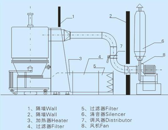 空氣經(jīng)加熱凈化后,由引風機從下部導入,穿過料斗的孔網(wǎng)板。在工作室內(nèi),經(jīng)攪拌和負壓作用形成流態(tài)化,水份快速蒸發(fā)后隨著排氣帶走,物料快速干燥。