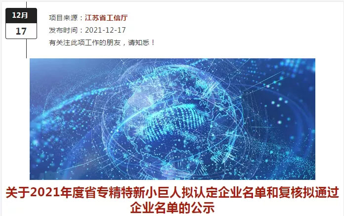 2021年12月17日,江蘇省工信廳公布了2021年度省“專精特新小巨人”擬定企業(yè)名單和復核擬通過企業(yè)名單。宇通干燥經(jīng)企業(yè)申報、市縣審核推薦、形式審查、專家評審等程序成功入圍。