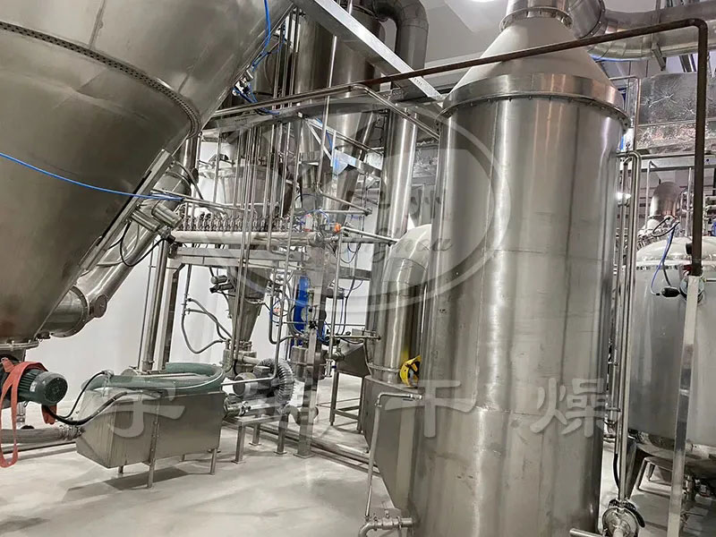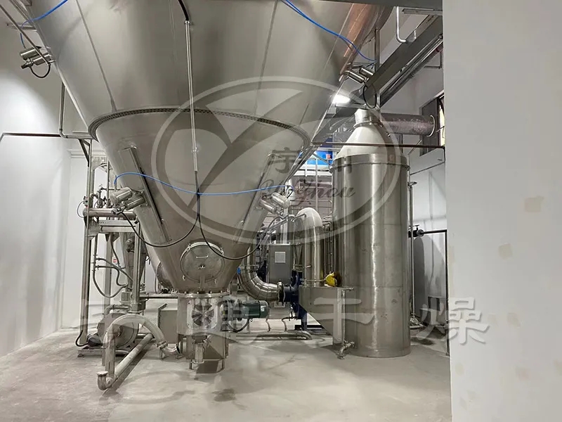 本設備研發(fā)了基于耦合流場理論、工藝參數(shù)優(yōu)化和多技術(shù)耦合智能控制的干燥系統(tǒng)。采用氣囊密封、氣缸抖動等技術(shù),實現(xiàn)了低強度和高效自動落料上料,物料充分回收,干燥和制粒效果好。頂部下噴霧、底部沸騰干粉,細化霧滴和增大密度,霧滴與干粉充分高密度接觸,產(chǎn)品粒度無級可調(diào);帶粘性半濕狀霧滴顆粒細料與干粉迅速粘結(jié)成低濕度粒體,實現(xiàn)了無粘結(jié)劑的制粒和干燥。有機溶劑回收率99%以上,尾氣中有機溶媒100%回收利用,提高了干燥速度、品質(zhì)和純度。