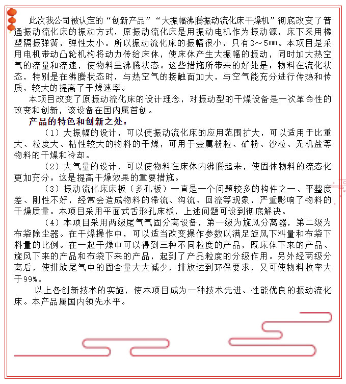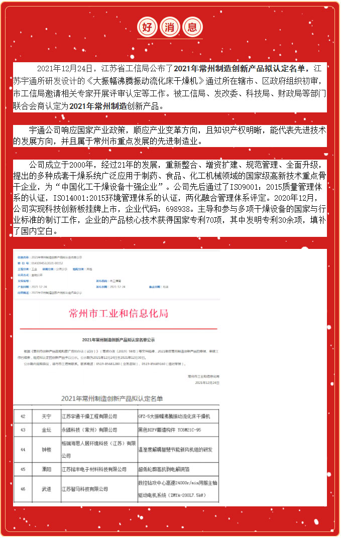 好消息!江蘇宇通所研發(fā)設(shè)計(jì)的《大振幅沸騰振動(dòng)流化床干燥機(jī)》被工信局、發(fā)改委、科技局、財(cái)政局等部門(mén)聯(lián)合會(huì)商認(rèn)定為常州制造創(chuàng)新產(chǎn)品。